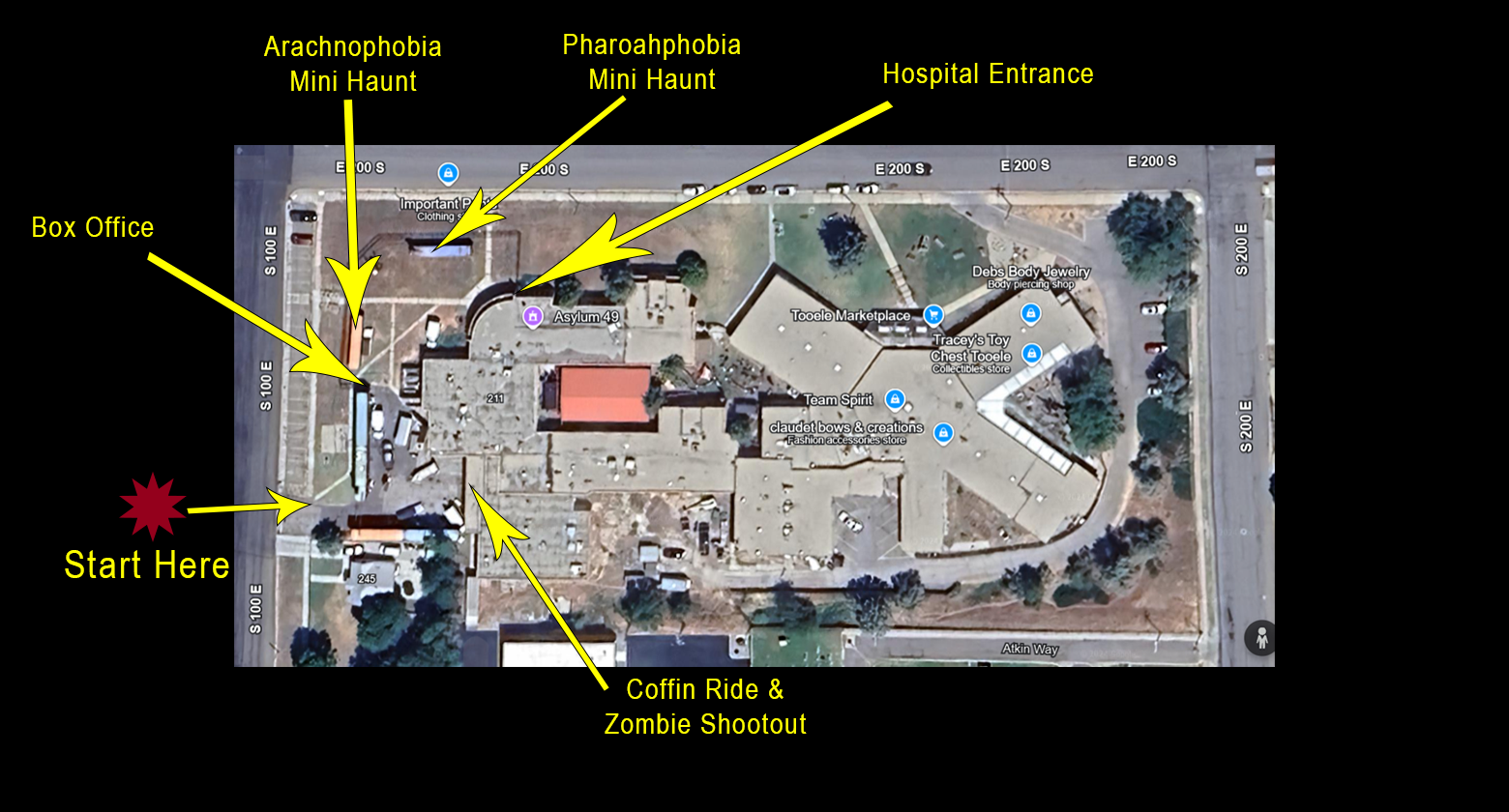 To access the haunt, you must have a general admission ticket or stat pass. Enter at the main gate on 200 east. If you have your tickets, you will be scanned in and can begin your experience. If you need to purchase admission tickets, proceed to the box office.